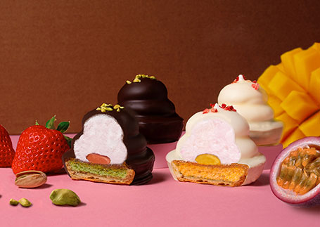 サクッとしたパイの上にフルーティーなマカロンとガナッシュを重ね、マシュマロを絞り仕上げにチョコでコーティング。まるみのある愛らしいフォルムもこだわりの一つ。様々な素材のマリアージュと食感を楽しめる常設店舗のないマシュマロスイーツです。